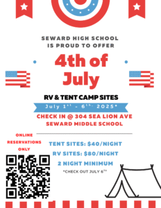 You’re in luck as Seward High School is again offering family-friendly accommodations from July 1-6! The cost is $40/night for tents and $80/night for RVs, with a two-night minimum.